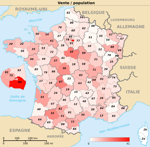 Voici une carte de France des départements qui aiment « La fractale des raviolis ». Pour chaque département, le ratio : nombre de ventes divisé par la population est calculé. Plus le chiffre est rouge et plus le nombre de ventes par millier d’habitants est important. Je suis assez vexé que le 63 – où j’habite – est moins rouge que le 45 ou le 87 ! 😉