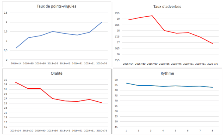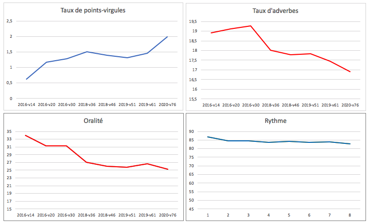 Quelques points de mesure évoluent nettement entre la première version (2016) et le manuscrit définitif (2020). Tandis que le rythme du récit reste constant, l’oralité diminue, signe d’un travail sur l’écriture, confirmé par la chasse aux adverbes et l’ajout de points-virgules (symptomatiques de phrases plus structurées).