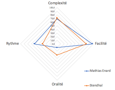Avec ce logiciel, j’affirme haut et fort, que le style de Mathias Enard se rapproche davantage de celui de Stendhal (12,9, son plus proche score) que de celui de Balzac (16,6). Ahah ! Quel plaisir que de contredire Le Nouvel Obs (sans rancune, hein ? :-))