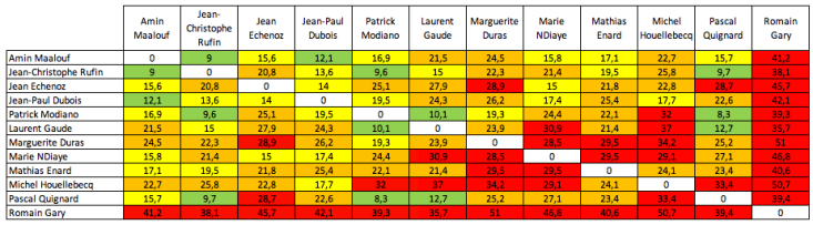 Contrairement à l’idée reçue que « tous les Amélie Nothomb se ressemblent », la matrice ci-dessous montre une certaine diversité dans le style que cette romancière emploie. C’est une des rares à franchir la barre du orange – sans emprunter un pseudonyme.