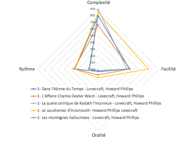 Soulignons aussi la limite de l’exercice : comparer un texte en français avec une traduction introduit forcément un biais (il faudrait vérifier que la traduction de dénature pas le texte d’origine). Par contre, une analyse plus poussée de l’oeuvre de Lovecraft, montre une hétérogénéité non négligeable.