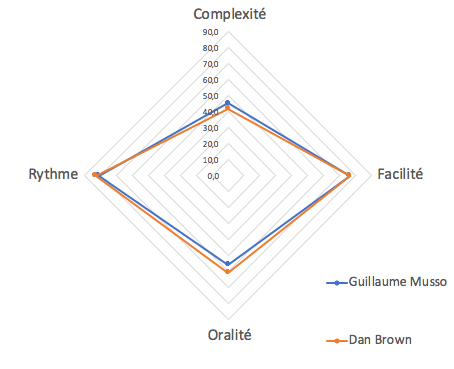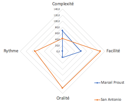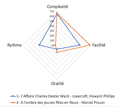 On obtient des diagrammes radar de ce style, bien pratiques pour comparer 2 auteurs.