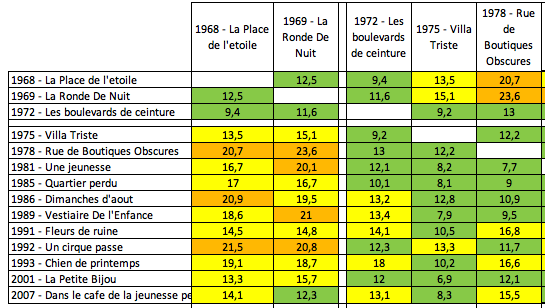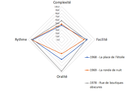 Pour illustrer, voici l’empreinte radar de ses deux premiers romans et de Rue des boutiques obscures qui lui valut le Goncourt dix ans plus tard en 1978.