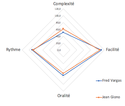 Exemple évident : nous savons tous que San Antonio n’a pas du tout le même style que Marcel Proust. Une plus grande oralité, un rythme plus rapide, une grande facilité. Mais cet exemple outrancier est important pour introduire une notion importante : cette méthode n’est pas destinée à juger de la qualité d’une oeuvre. L’analyse du style ne préjuge pas de la qualité littéraire d’un roman ou de sa puissance narrative. Avec cette méthode, Marcel Pagnol a un score important en oralité et Albert Cohen, en facilité. A titre d’illustration, voici la comparaison entre Jean Giono et Fred Vargas : deux genres différents, deux regards différents sur le monde, et pourtant, des styles très comparables selon ce logiciel.