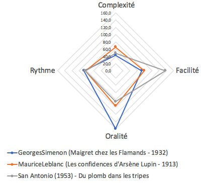 Maurice Leblanc a le style le plus « littéraire » des trois. Simenon, un texte plus travaillé mais davantage porté sur les dialogues. San-Antonio, un style plus grand public. Encore une fois, la comparaison est purement analytique et ne compare pas la richesse du vocabulaire, l’inventivité du style ou le suspens de l’intrigue.