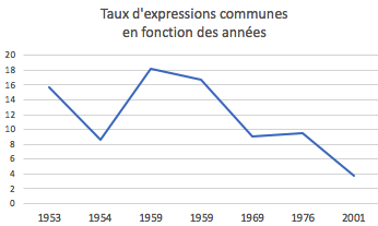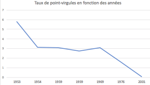 Signalons toutefois deux baisses notables au fil du temps : le taux d’expressions communes (« blanc comme neige ») et l’usage des points-virgules (le sacrifié de la littérature contemporaine).