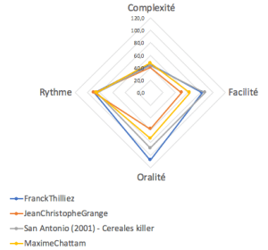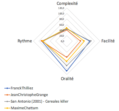 Ensuite, les deux critères facilité et oralité (nombre de dialogues, taux de !, ?, … et mots vulgaires) sont vraiment différents d’un auteur à l’autre. Autant de styles que d’auteurs, c’est une bonne nouvelle pour la littérature policière qui n’est pas cantonnée dans un style imposé.