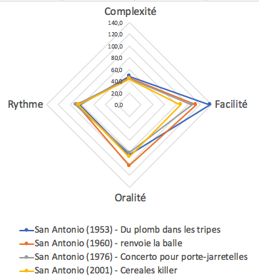 Frédéric Dard s’est illustré par l’emploi d’un vocabulaire fleuri de son cru. Il a créé une véritable signature en inventant des milliers de mots (le dictionnaire San-Antonio existe et je vous le conseille). En conséquent, il passe sous le radar de mon analyse sur le critère « mots grossiers ». Ma liste de 130 mots grossiers ne vaut pas tripette face à ses expressions faites maison : beurrer la coquelle, brandonner du calbar, éjaculance et autres figouses. Ce biais baisse la note d’oralité, mais c’est le jeu ! Dans le texte, il y a effectivement peu de mots grossiers, même si la thématique globale reste pas mal en dessous de la ceinture (le célèbre humour grivois).