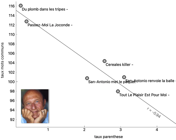 Enfin, pour San Antonio, c’est le taux de parenthèses (pour 10 000 signes) qui est corrélé (R=-0.94) au taux de mots communs.