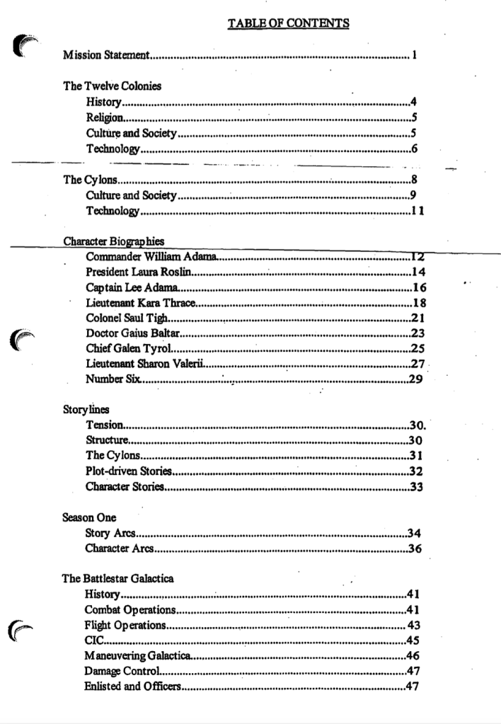 Ce document est très instructif à lire pour comprendre les fondamentaux qui définiront la philosophie l’âme de la série. Vous trouverez ce document dans votre moteur de recherche (battlestar gallactica bible Moore pdf) ou directement ici.