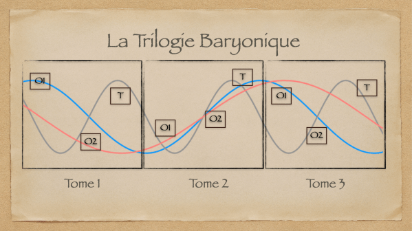 La structure narrative de la Trilogie Baryonique s'inspire des séries TV. Il y a plusieurs "arc narratifs" que l'on suit tout le long des 3 tomes (représentés ici par les différentes sinusoïdes). Un arc narratif correspond à une intrigue, un problème moral à part entière : par exemple les motivations anti-progrès des Bernanos, la découverte... Lire la Suite →